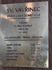 Velký zvon (Sv. Vavřinec a Václav) spodní průměr 135 cm, váha 36 centýřů (téměř 2 000 kg), odlil v roce 1709 zvonař Ant. Schönfeld v Praze.