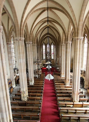 V témž roce se 15. srpna, na svátek Nanebevzetí Panny Marie, konala slavnost svěcení základního kamene nového chrámu. Chrám byl vysvěcen 29. června 1889 na slavnost svatých Petra a Pavla. Je výrazem dobového obdivu ke gotice a navrhl ho pražský architekt Šimon Tragl. Jedná se o trojlodní chrám s vchodem a věží v průčelí, s příčnou lodí a s šestibokým presbytářem, vycházející z půdorysného vzoru gotické katedrály. Provedení stavby bylo svěřeno vrchlabskému staviteli Eduardu Zirmovi. Architektura chrámu působí monumentálním dojmem. Hlavním chrámovým prostorem je trojlodní hala, dlouhá 30 a široká 18 metrů. K ní je na západní straně nad vchodem připojena 60 metrů vysoká jehlancovitá věž s nárožními věžičkami. Na straně východní pak půdorys chrámu doplňuje do tvaru latinského kříže příčná loď s presbytářem, s přístavbou sakristie a hraběcí oratoře. Lodě jsou sklenuty krásnou křížovou klenbou, vysokou v hlavní lodi 15,5 m.
