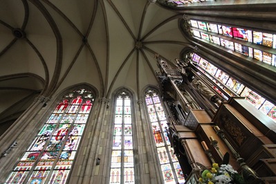 Příčnou loď zakončují z obou stran krásná barevná vitrážová okna s motivy Zvěstování Páně a Narození Páně. Na nynějším hlavním chrámovém oltáři zastupuje svatého Vavřince, jemuž je kostel zasvěcen, socha Boha Otce s anděly, pod kterou se nachází socha Ježíše Krista. V presbytáři můžeme obdivovat další barevná transparentně malovaná okna: třídílné s motivem apoštola germánských národů sv. Bonifáce, a 6 dvoudílných s motivy (zleva) svatého Aloise, svatého Antonína z Padovy a sv. Františky, svatých Petra a Pavla, na jejichž svátek byl roku 1889 chrám vysvěcen, sv. Vavřince, patrona tohoto chrámu, svatého Jana Nepomuckého a svatého Václava, patronů země české a svatého Augustina se svatou Monikou, patronů vrchlabského klášterního kostela. Okna pocházejí z dílny firmy Geylings Erben z Vídně.
