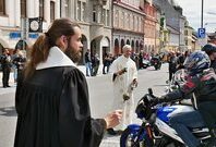 Kostel byl jako obvykle v přední části vyzdoben krásným naleštěným motocyklem a tabulí oznamující dnešní akci. Letošní téma vycházelo z Janova evangelia, které se odehrávalo u studny Jakubovy, kam si unavený Ježíš přišel odpočinout a požádal samařskou ženu, aby mu dala napít. Proto byla před oltář umístěna také studna se džbánem a zapálenými svícemi. Během promluvy P. Šlégr zmínil důležitost studny a dobrých živých pramenů, které pro zájemce Bůh zdarma otvírá. Vyzval ke zmapování studánek, kam bychom se mohli jezdit občerstvovat. Připomněl, že duchovní studny můžeme zahlédnout v lidských očích, jež jsou odrazem toho, co ukrývá srdce. Nestačí si jen studnu vyfotit a sdílet, ale aby se člověk občerstvil, je třeba se ke zdroji živé vody vydat, což např. ve Vrchlabí před čtyřmi týdny udělalo 6 dospělých žen, když se daly o Velikonocích pokřtít. Návštěvníci kostela si mohli vzít s sebou svěcenou vodu připravenou ve sklenicích. Na obřadu byl kromě jiných také Krakonoš, který dostal za úkol najít mezi motoristy člověka, který si sebou v rámci kázání odvezl darovanou kropenku, aby mohl doma mít malou studnu a zdroj „živé vody“.